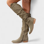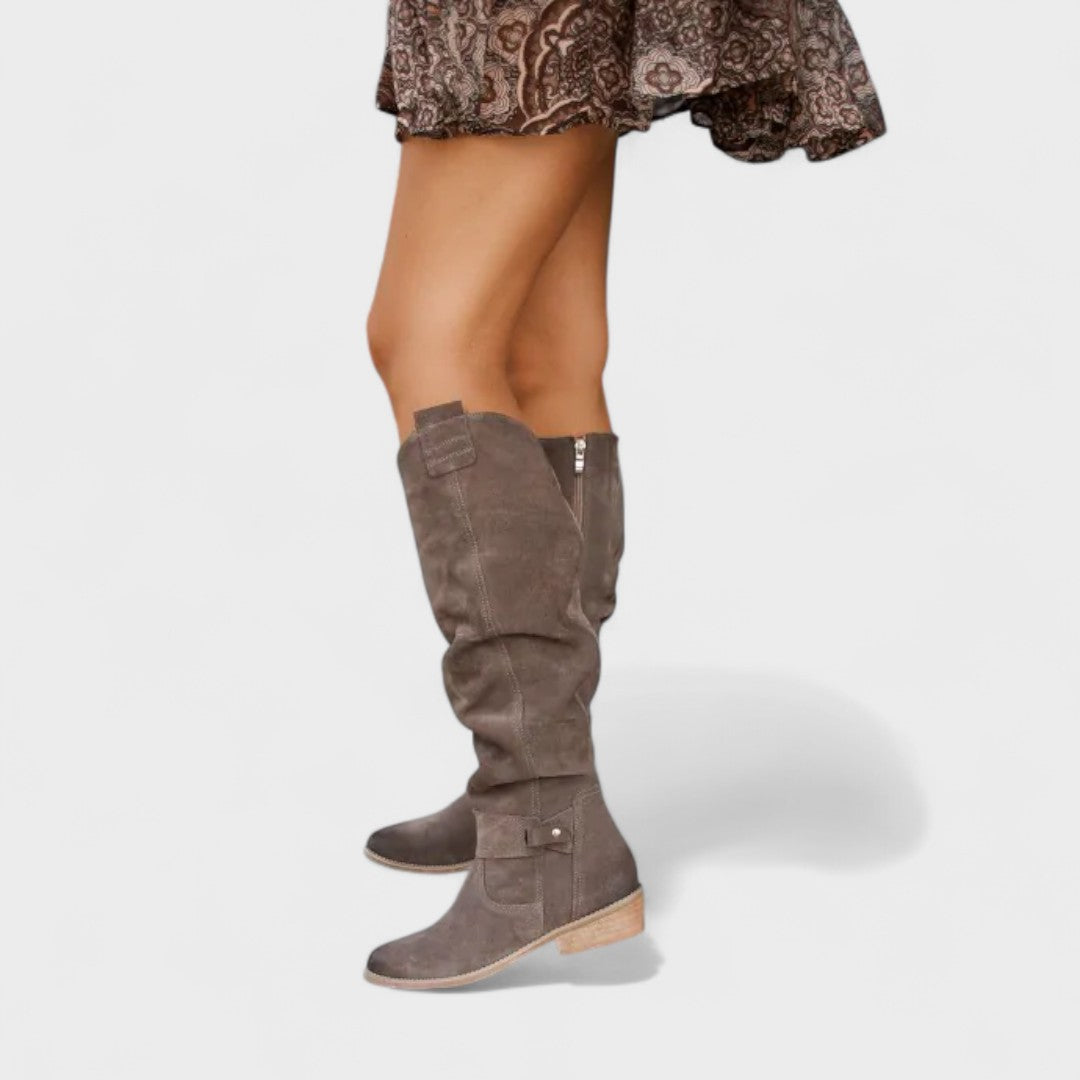 Ove visoke čizme donose urbani šik i udobnost u jednom koraku. Mekano, lagano gornjište s elegantnim naborima prianja uz nogu i pruža opušten, sofisticiran izgled. Bočni patentni zatvarač omogućuje brzo obuvanje, dok niska blok peta nudi stabilnost za cjelodnevno nošenje. Suptilni detalji poput ukrasne kopčice daju dozu profinjenosti koja se lako kombinira s haljinama, suknjama ili trapericama. Savršene za posao, kavu u gradu ili večernji izlazak.