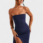 Elegantna maksi haljina bez naramenica dizajnirana je da naglasi figuru i produži siluetu. Naborani korzet lijepo oblikuje područje prsiju i struka, dok visoki bočni prorez s asimetričnim padajućim panelom daje efekt crvenog tepiha i otkriva upravo onoliko koliko treba. Rastezljiva, glatka tkanina prati pokret i pruža udobnost od prve zdravice do zadnjeg plesa. Savršena za vjenčanja, gala događaje i sve večeri kada želiš izgledati besprijekorno.
