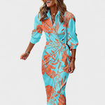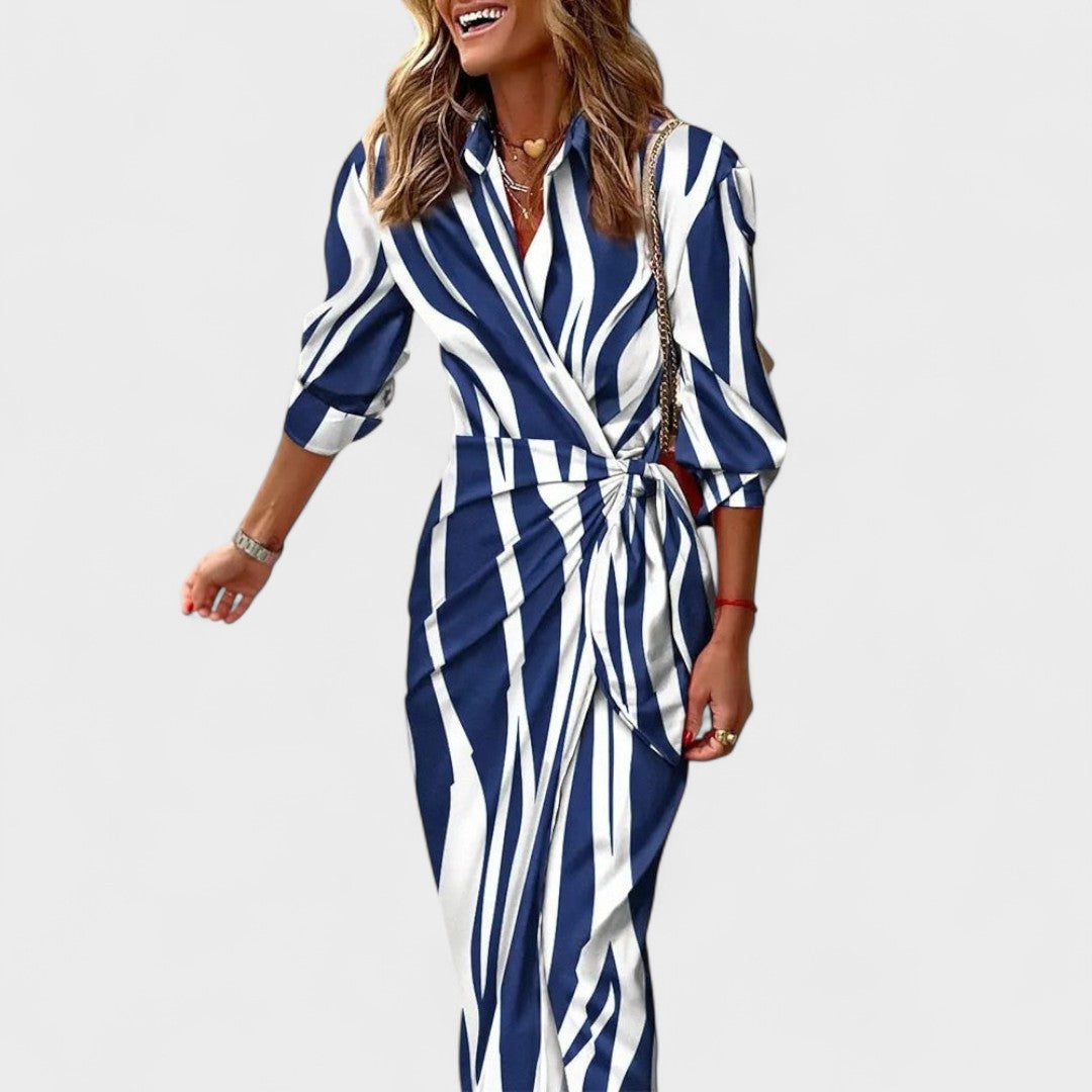 Košulja-kroj s elegantnim ovratnikom i gumbima, lagana i podatna tkanina koja lijepo pada te fluidna silueta s profinjenim prorezom – ova šarena duga haljina stvorena je za trenutni efekt. Suptilno naglašava struk i pruža slobodu kretanja, pa jednako dobro funkcionira u dnevnim kombinacijama i večernjim prilikama.