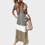 Ova prozračna i udobna maxi haljina savršena je za tople ljetne dane i opuštene trenutke. Svojim ležernim krojem pruža maksimalnu udobnost, dok kombinacija boja daje moderan i boho izgled. Idealna je za plažu, šetnje gradom ili ljetne izlete, a lako se kombinira s sandalama, šeširom i velikom torbom za savršen ljetni stil.
