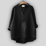Elegantna lanena bluza u bijeloj boji koja isijava svježinu i bezvremenski stil. Ima V-izrez s diskretnim kopčanjem, duge rukave koji se mogu podići i asimetričan završetak s dužim stražnjim dijelom, pružajući udobnost i lakoću pokreta. Idealni izbor za cool ljetne kombinacije ili elegantan casual izgled.