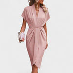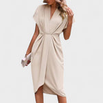 Elegantna midi haljina s profinjenim V-izrezom, blagim naborima u struku i diskretnim prorezom koji produžuje siluetu. Mekana, podatna tkanina lijepo pada i pruža udobnost kroz cijeli dan, dok čiste linije omogućuju lako stiliziranje – od poslovnih prilika do svečanih večeri.