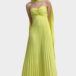 Istaknite svoj sjaj i ženstvenost s ovom očaravajućom maksi haljinom u intenzivnoj žutoj boji. Njezina plisirana tekstura i bez naramenica dizajn skladno obavijaju vašu siluetu, pružajući dojam elegancije i nenametljive luksuznosti pri svakoj vašoj pojavi.