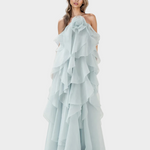 Ova prekrasna duga haljina u toploj smeđoj nijansi isijava luksuz i romantiku. Dizajnirana s višeslojnim volanima od lagane i prozračne tkanine, stvara impresivan pokret pri svakom vašem koraku.